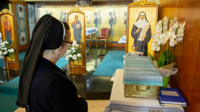 Сестра Софія Лебедович, Генеральна настоятелька Згромадження сестер служебниць, молиться біля мощей Блаженної Йосафати, в каплиці Генерального Дому в Римі